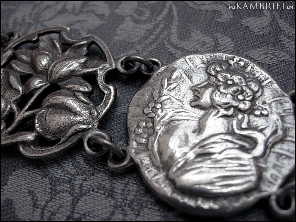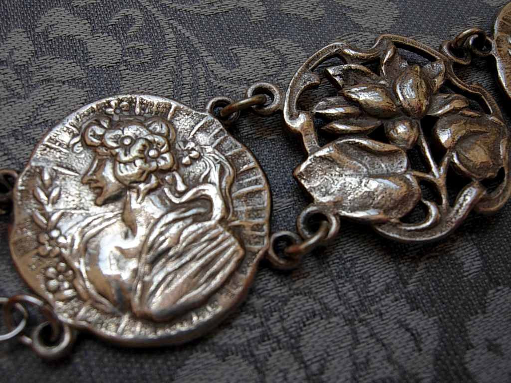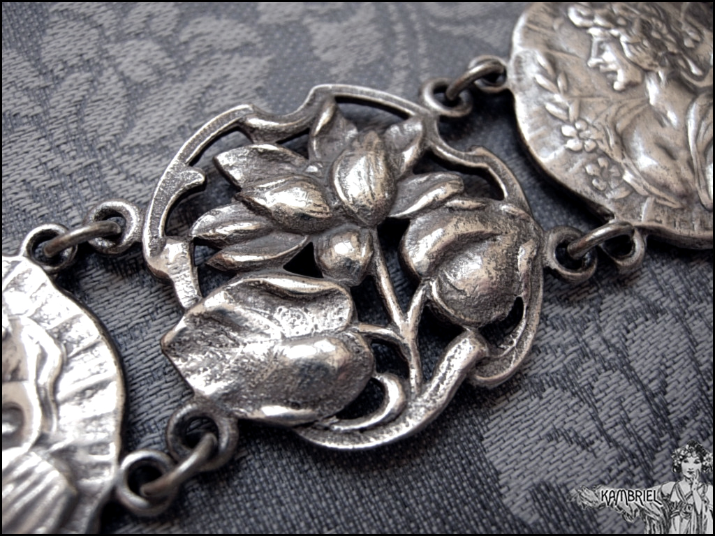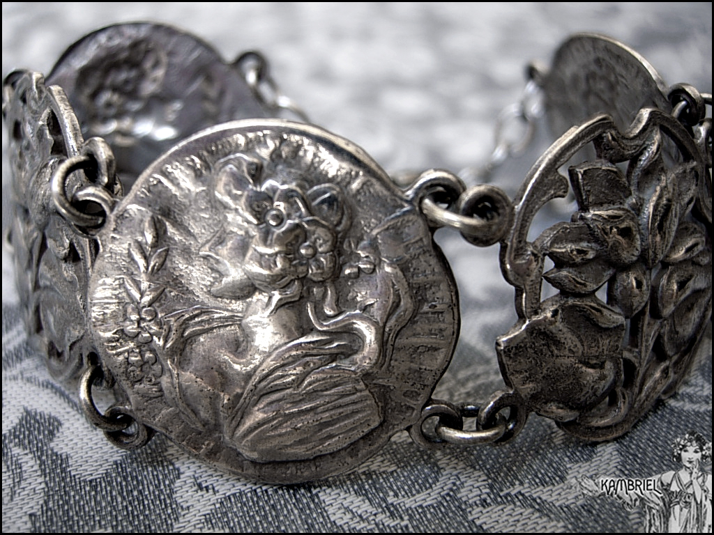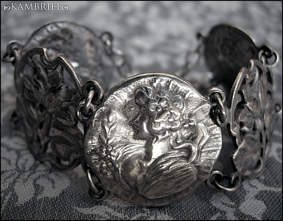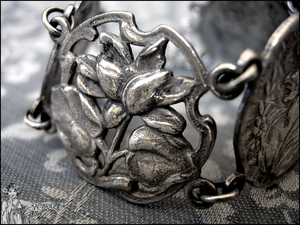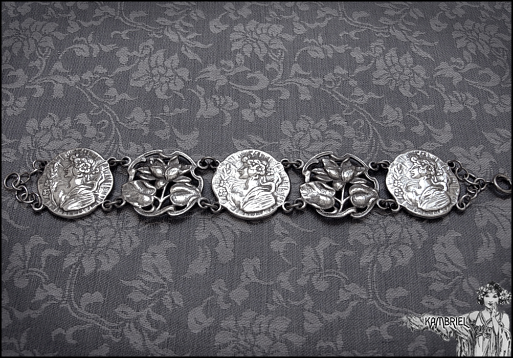 This elegant Art Nouveau bracelet has an intricate design of stylized filigree lotus or water lily flowers in serpentine curves, alternating with a graceful woman in a diaphanous dress and flowers in her hair. The main motifs are made from an antique (circa 1910) unmarked silver tone metal ~ likely nickel silver aka British EPNS metal, that still has a wonderful gleam after all these years, along with a subtle natural patina to bring out all of the romantically carved details. The bracelet measures approx. 7" when flat, and each of the decorative motifs are approx. 1" wide.