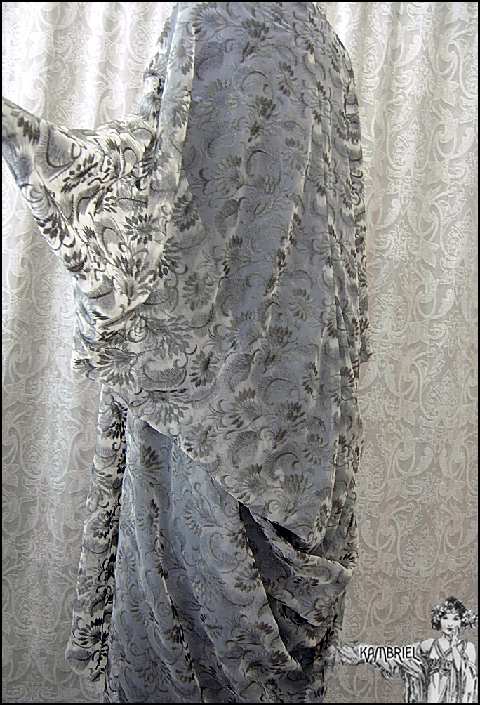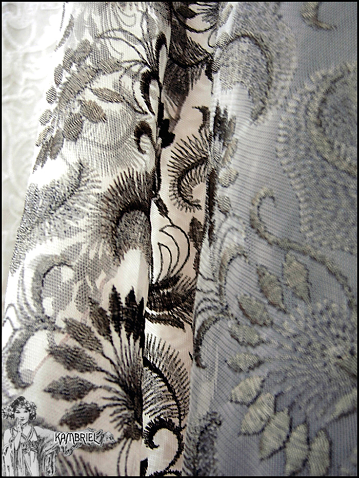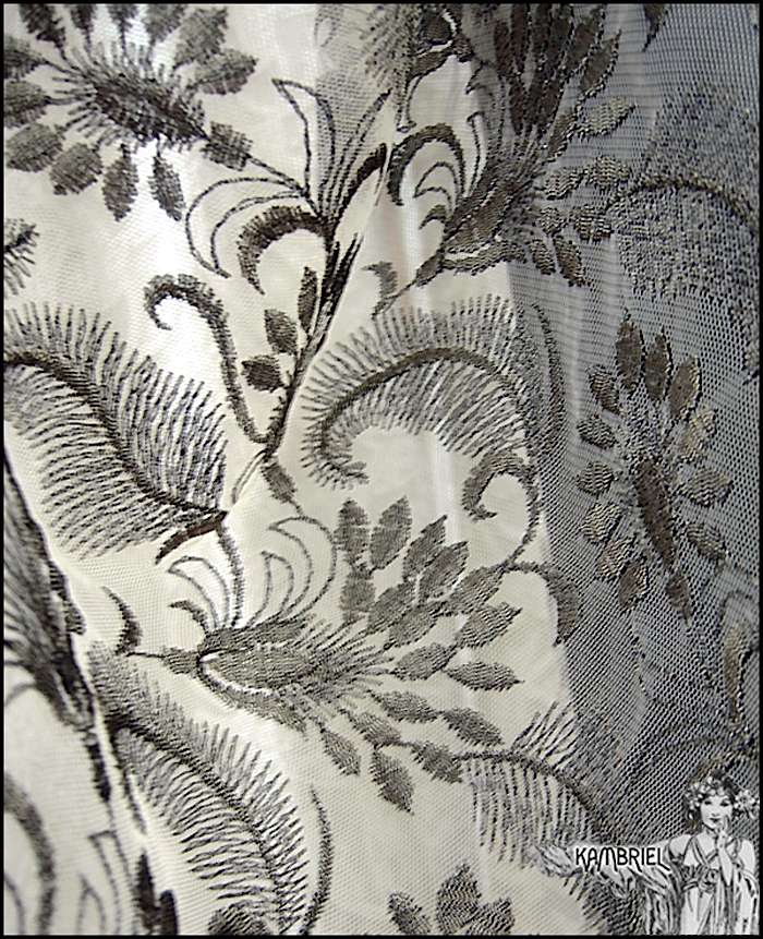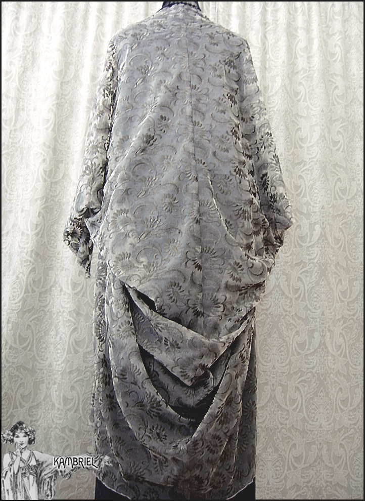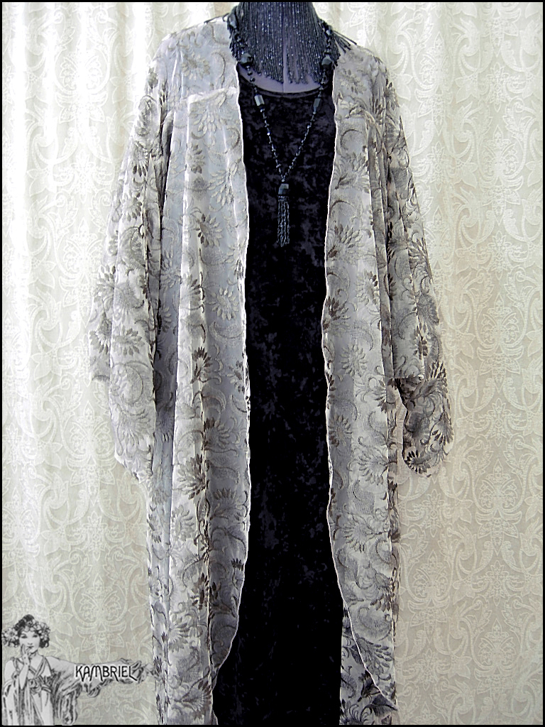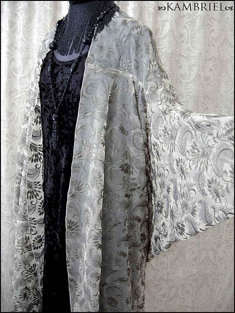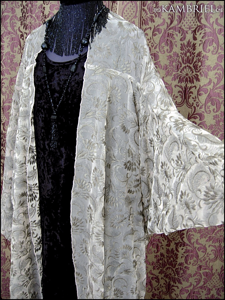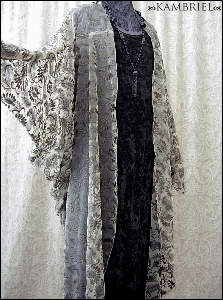 This one of a kind, ethereal cocoon robe by Kambriel is fashioned from a sumptuous layer of sheer netting, intricately embroidered in a foliate design in tones of glistening antique bronze upon a pale taupe background. Sinuously draping, it will add a decadent elegance to any ensemble and fit a wide range of anywhere from petite to plus sizes due to the overall silhouette and open front. This limited edition coat will transport you to an era of romantic opulence... The measurements are quite amorphous due to the way this design drapes, but are ~approximately~ 43" long in the front from shoulder to hem, tapering down to approx. 52" in the back, while the sleeves are approx. 26" long, and wrist circumference approx. 8 1/2". Truly a design to transport one's spirit to an opulent realm of dreams...