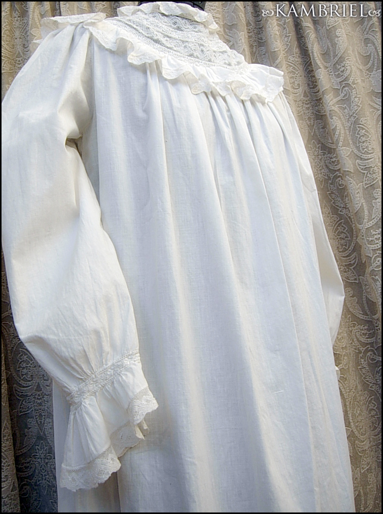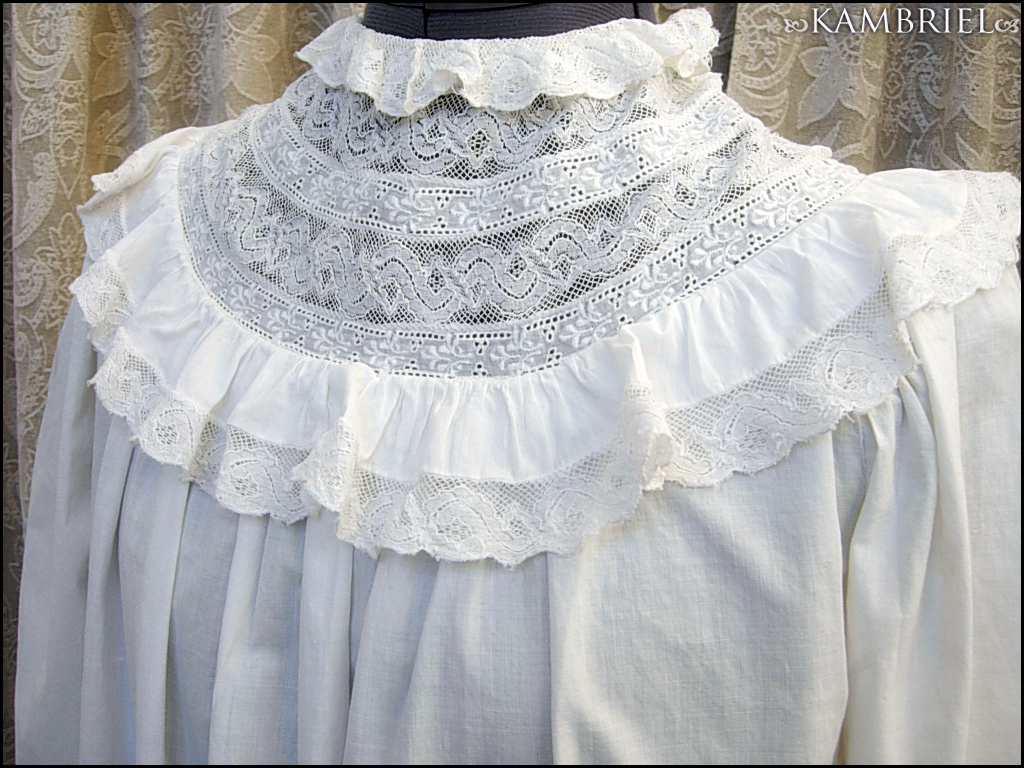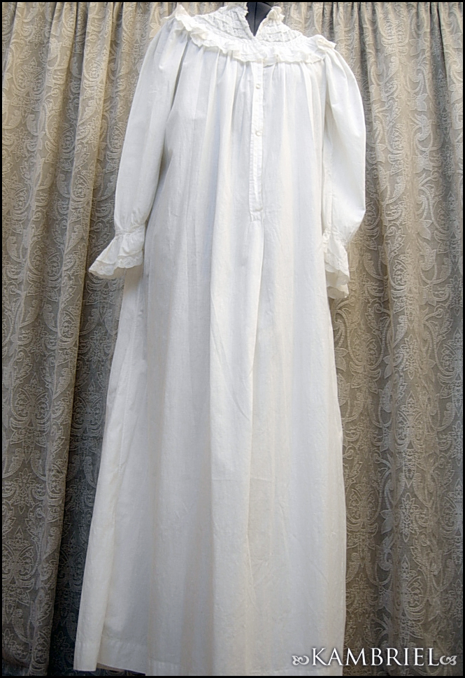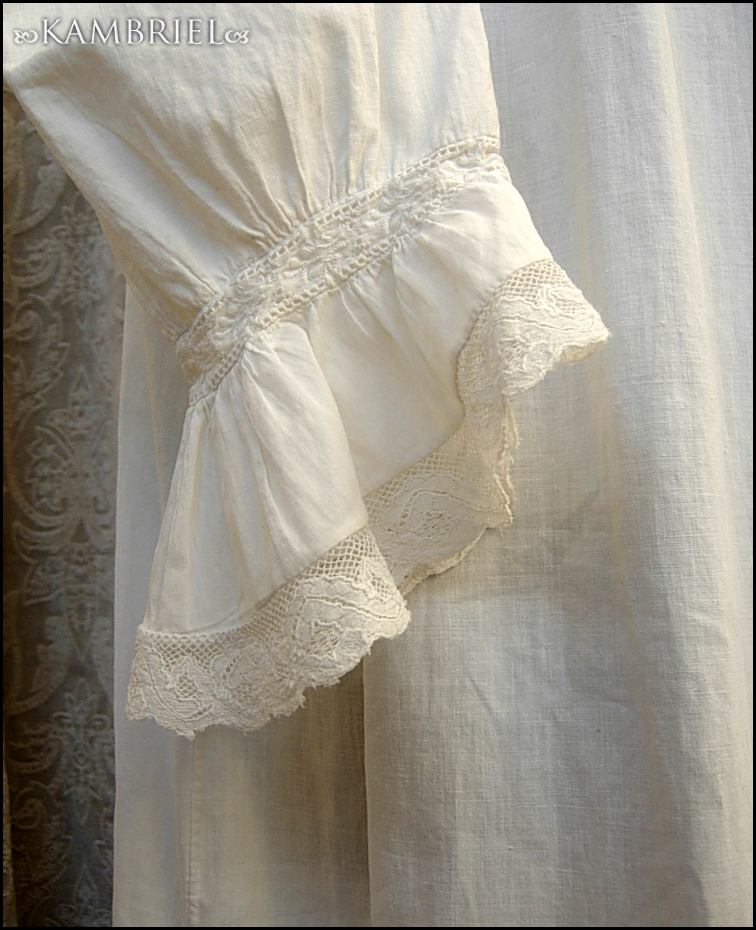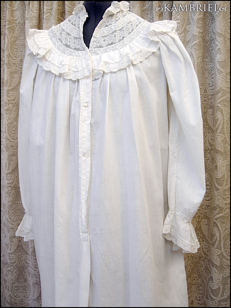 This wonderfully diaphanous, full length, authentic antique nightdress features a wonderful neckline made from thin white cotton, along with row upon row of delicate netted lace inserts and gathered ruffles. This gown is in *amazing* overall condition for it's 100+ years of age! It has a nice ~full~ cut which flares out towards the lower hem, and romantic sleeves which have been gathered into cuffs, also embellished with yet more delicate lace. It closes with genuine mother of pearl buttons.