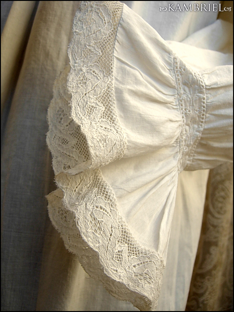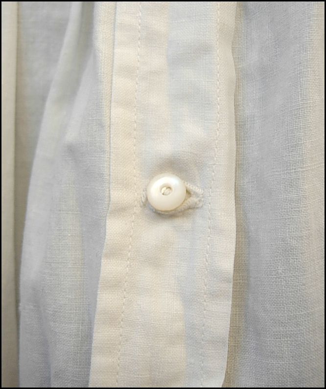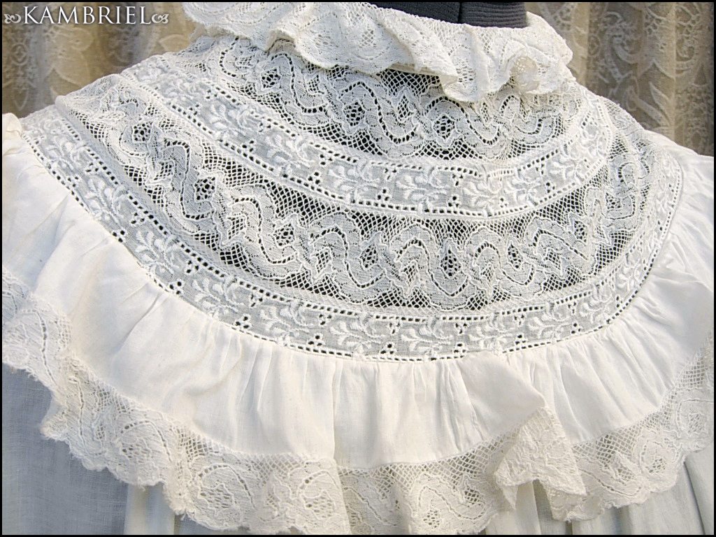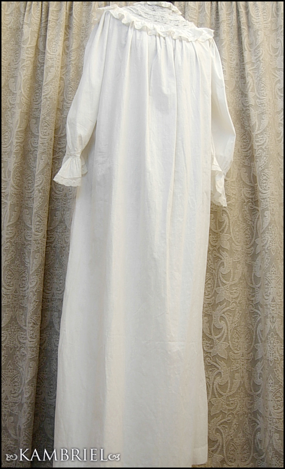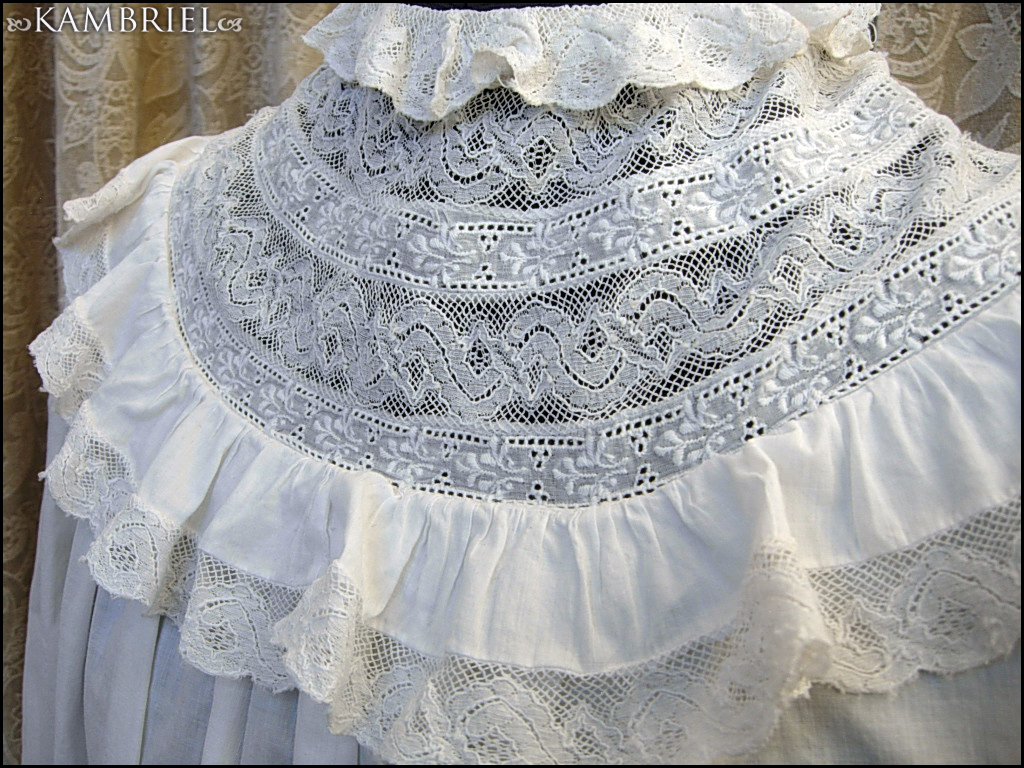 This wonderfully diaphanous, full length, authentic antique nightdress features a wonderful neckline made from thin white cotton, along with row upon row of delicate netted lace inserts and gathered ruffles. This gown is in *amazing* overall condition for it's 100+ years of age! It has a nice ~full~ cut which flares out towards the lower hem, and romantic sleeves which have been gathered into cuffs, also embellished with yet more delicate lace. It closes with genuine mother of pearl buttons.