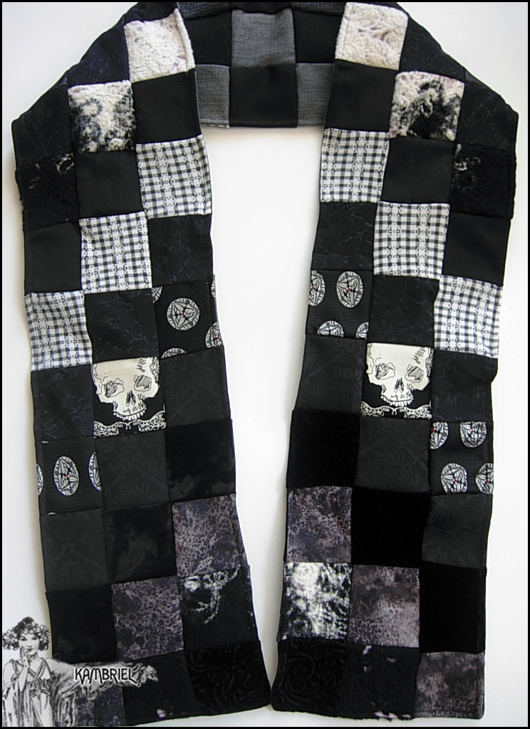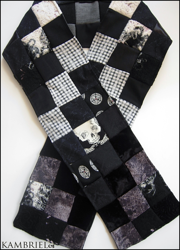 This darkly whimsical patchwork scarf by Kambriel is completely one of a kind and measures approximately 60" long x 6 1/2" wide. It is made from an assortment of 160 pieces (including overlays) of a variety of vintage fabrics in shadowed tones of black, white & greys including artfully handfelted wool with a cobwebby black & white tattered effect lined in soft lavender cotton which peeks out from beneath here & there, along with lustrous black moiré & brocade, soft cottons, lush velvets, and more! It is fully lined in a coordinating patchwork design comprised mostly of sturdy black & sandwashed grey cottons. This scarf works wonderfully for any gender & you can even use it as an altar cloth or table runner when it's not being worn, as well as make for a charming gift :)