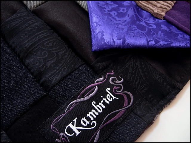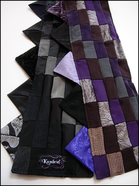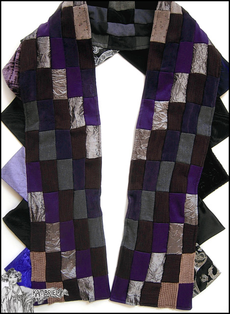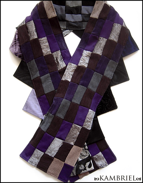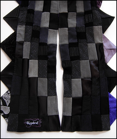 This completely one of a kind patchwork scarf by Kambriel measures approx. 58 1/2" long by approx. 7" wide (9" with the side embellishments), and is handmade from a collection of 264 vintage fabrics including overlays and the whimsical pointed accents (made from equally lovely brocades, silk, velvets, and more) running alongside one of the outer lengths! This scarf features a variety of vintage cottons, silk, rayon, moonlit crushed taffeta & so much more in a dusky range of deep plum, taupe, mocha, eggplant, and silvery grey hues. The lining is also made from a coordinating patchwork ~ this time all in cozy black and grey monochromatic shades. You could use this one of a kind scarf as a decorative table runner accent or altar cloth when it's not being worn, as well as make for a charming gift...