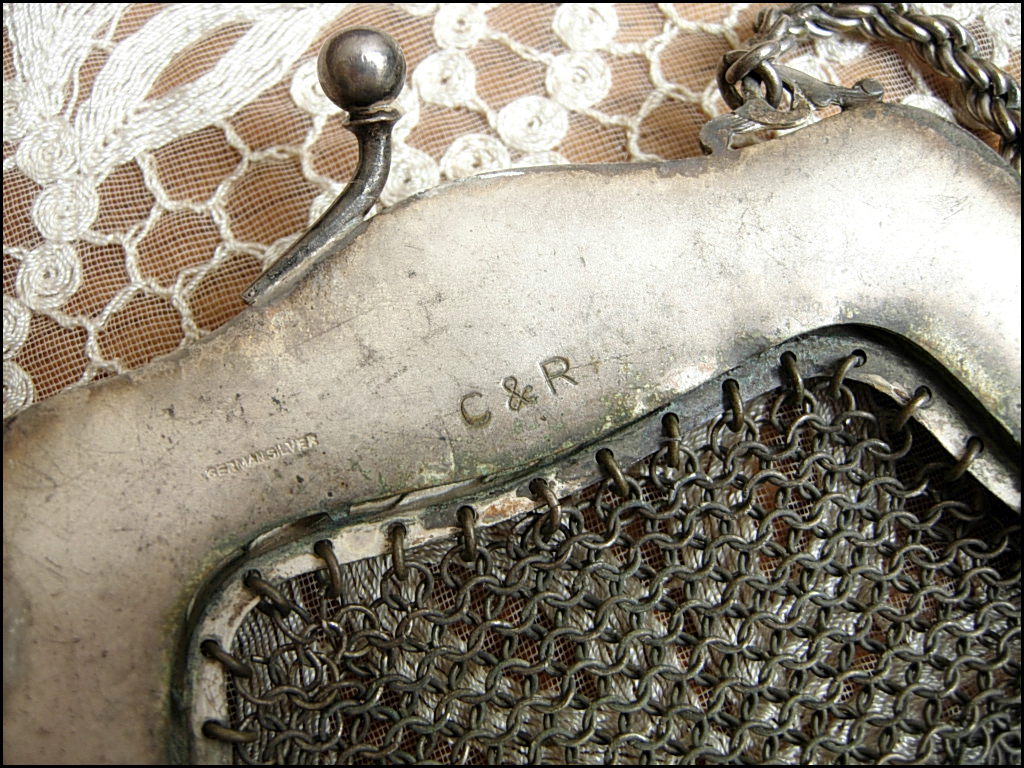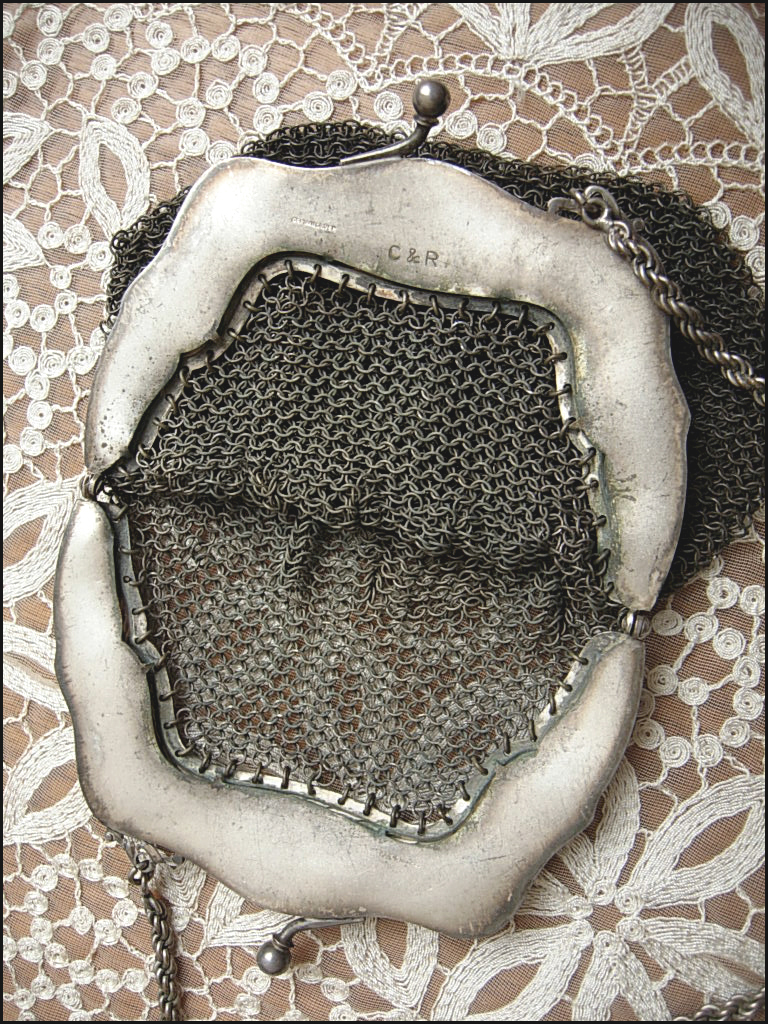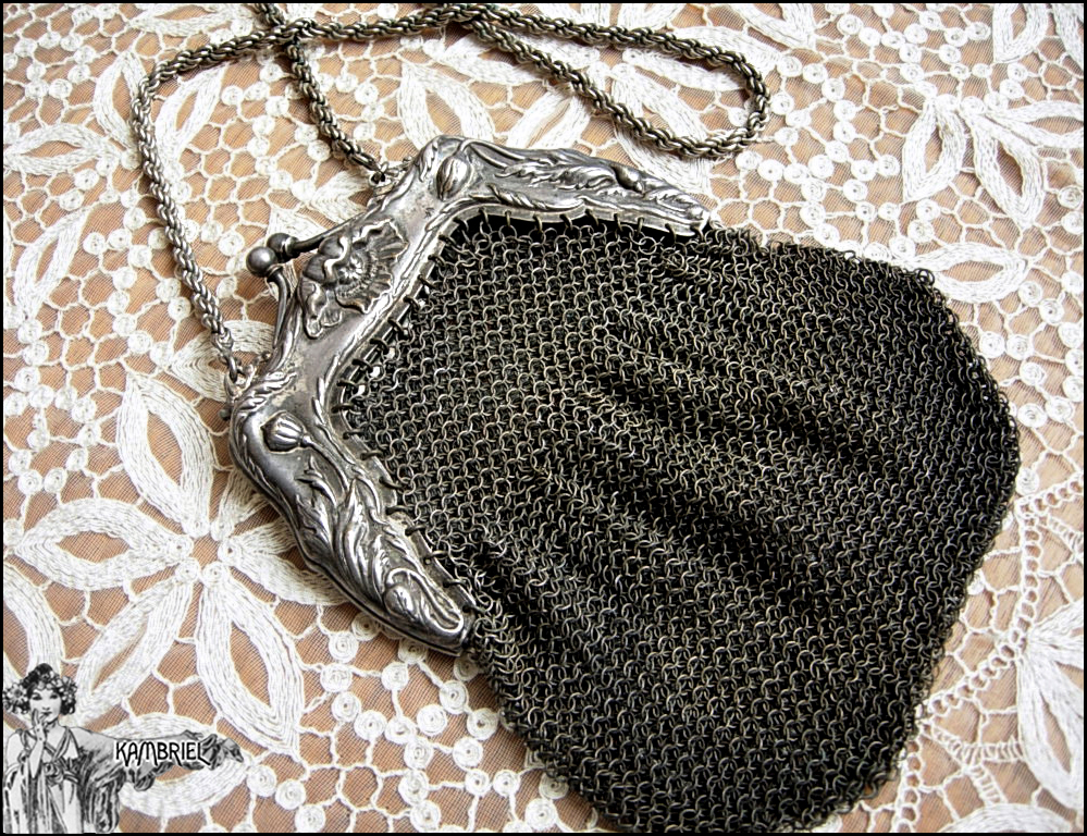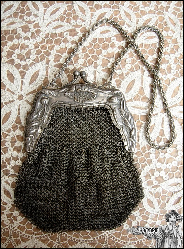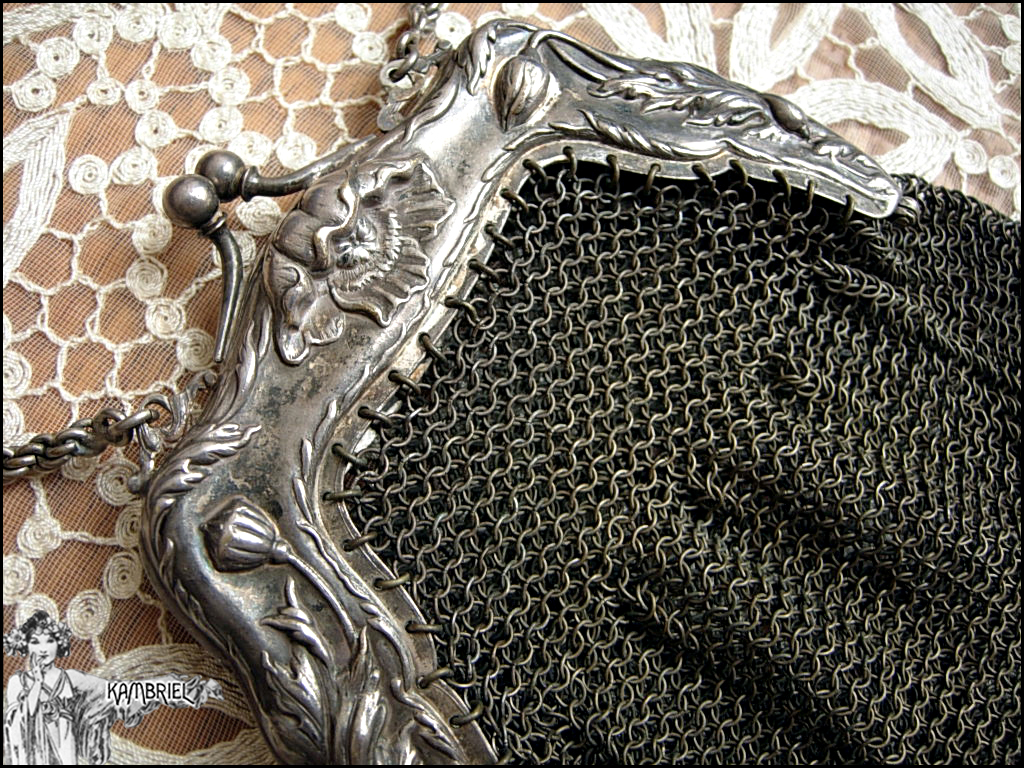 This antique Art Nouveau reticule purse dates back to the late 1800s/early 1900s & is made from German Silver (not Sterling) with a shadowy timeworn patina. The ornate frame features an elegant design of poppies along the top and sides. The mesh portion is linked in such a way that the purse has a nice flare to give a bit more carrying room. The purse itself measures approx. 6 3/4" in length (approx. 16" long if including the chain handle) by 6 3/4" expanded width for the mesh portion, or approx. 5 1/4" when it's softly draped. Such a lovely relic of a bygone time ~ the best parts of which are kept alive by little treasures like this! Would make a truly wonderful gift...