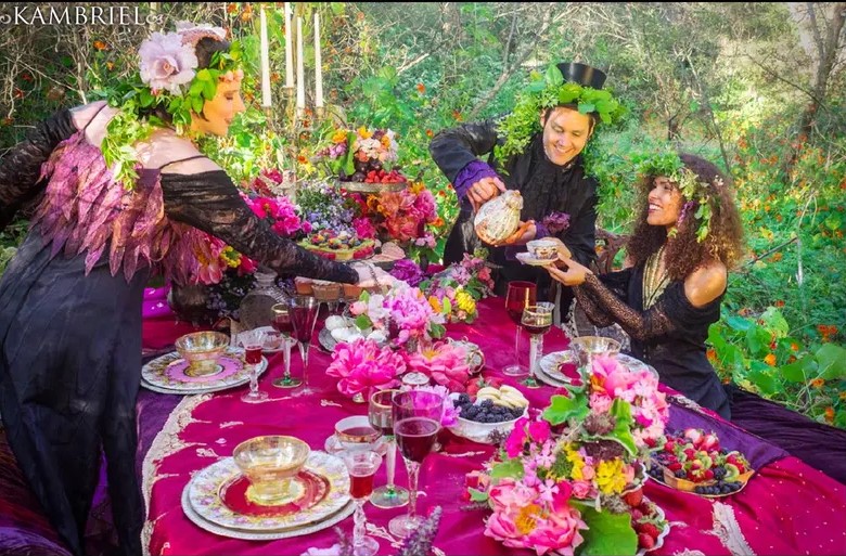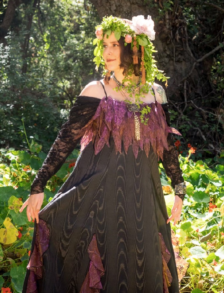 This completely one of a kind gown was featured in a fashion editorial in Faerie (now Enchanted Living) Magazine for a gloriously whimsical themed piece on a Fae-inspired Tea Party with outfits designed & created by Kambriel! It is fashioned from a combination of lustrous black moiré combined with black stretch lace for the dramatic off-the-shoulder sleeves, and accented with a multitude of iridescent organza, elaborate cutwork leaves and bias waterfall flounces in fiery sunset shades embroidered with metallic thread for added sparkle!