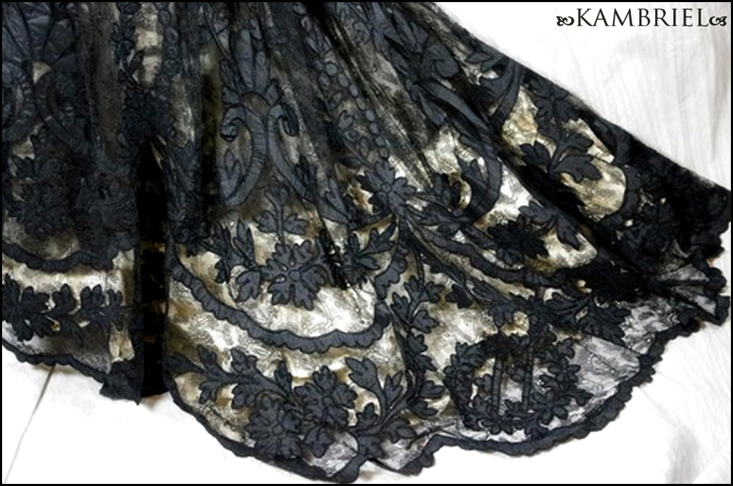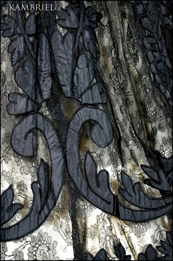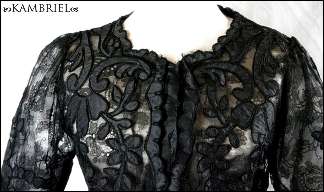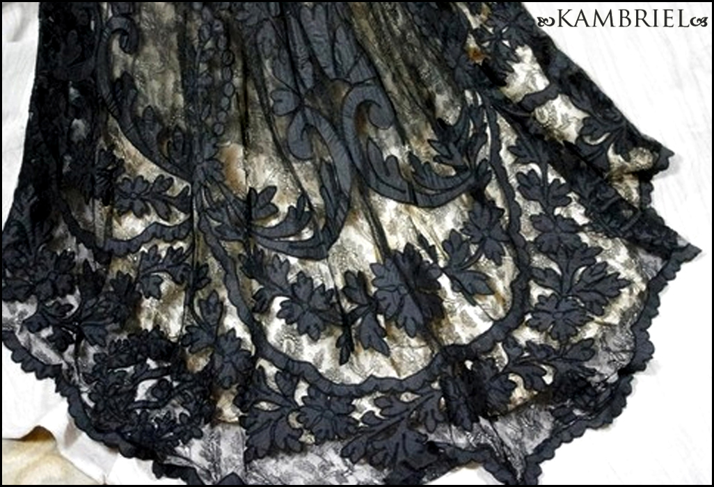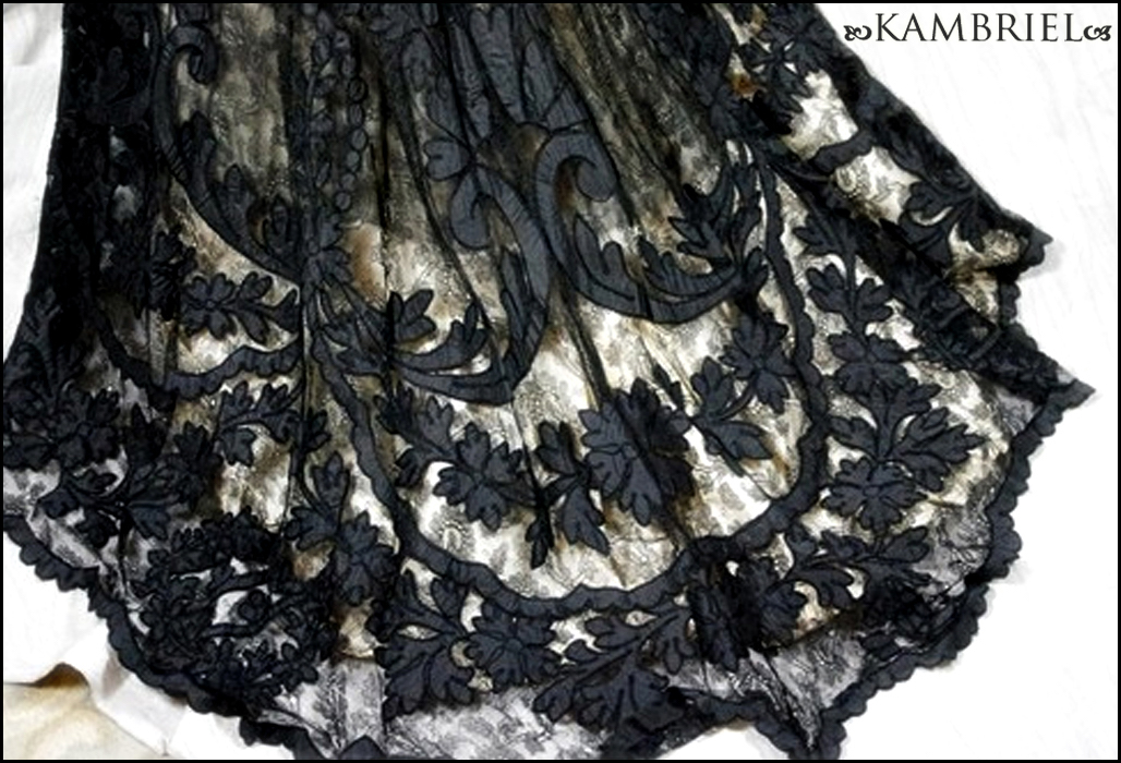 I found this absolute treasure of an antique Victorian (Napoleon III) era two-piece gown ensemble (comprised of a matching bodice top & skirt) many years ago in France. I've had my work featured in a Gothic Victorian museum exhibit before with a focus on mourning wear, and this piece is every bit as sumptuously detailed & lovingly made as those on display if not moreso. It has such an elegant, ghostly effect flowing out with an abundance of lace accented with graceful hand-cut silk appliqué work throughout, edged in delicated black cording, all of which gracefully drapes as it flares outward towards the very full lower hem with dramatic sweeping train. The ensemble has pale contrast lining within to help show off the incredibly delicate lace designs and give a darkly ethereal feel. Due to the fragility of the materials, this could be simply used for display, but it could also become the base of a hauntingly beautiful ensemble where this fragile beauty's signs of the passage of ~well~ over a century will add a sense of lush timeworn history to the overall effect!