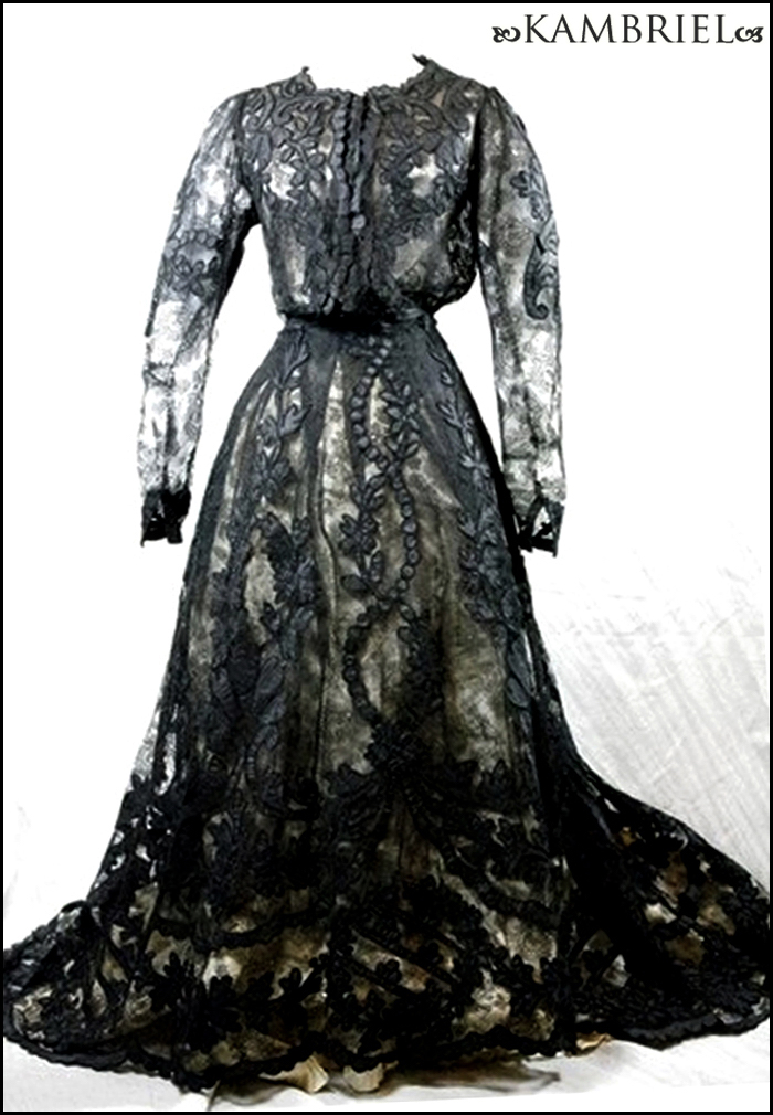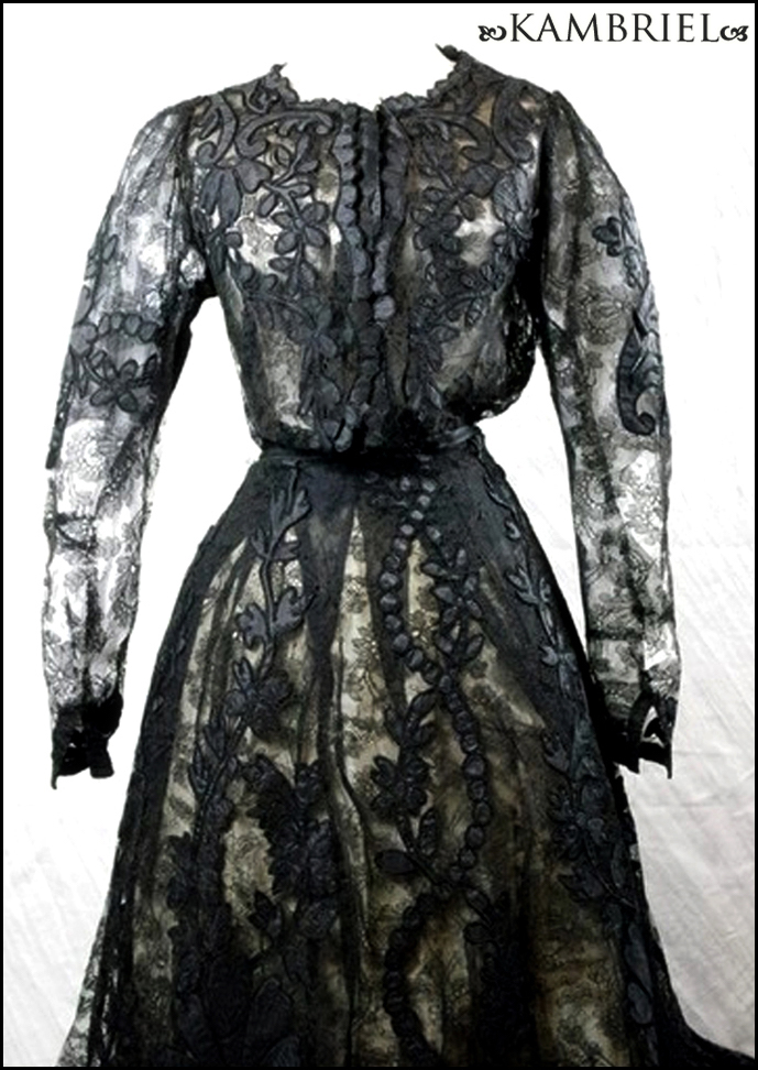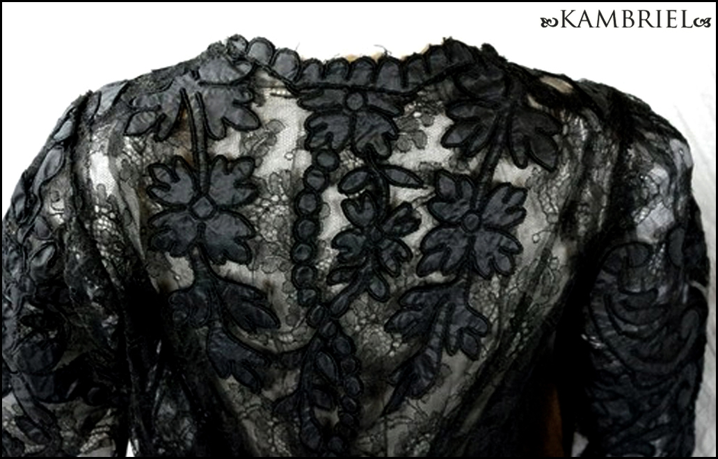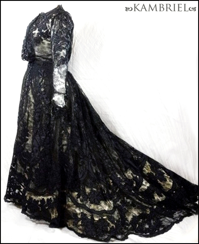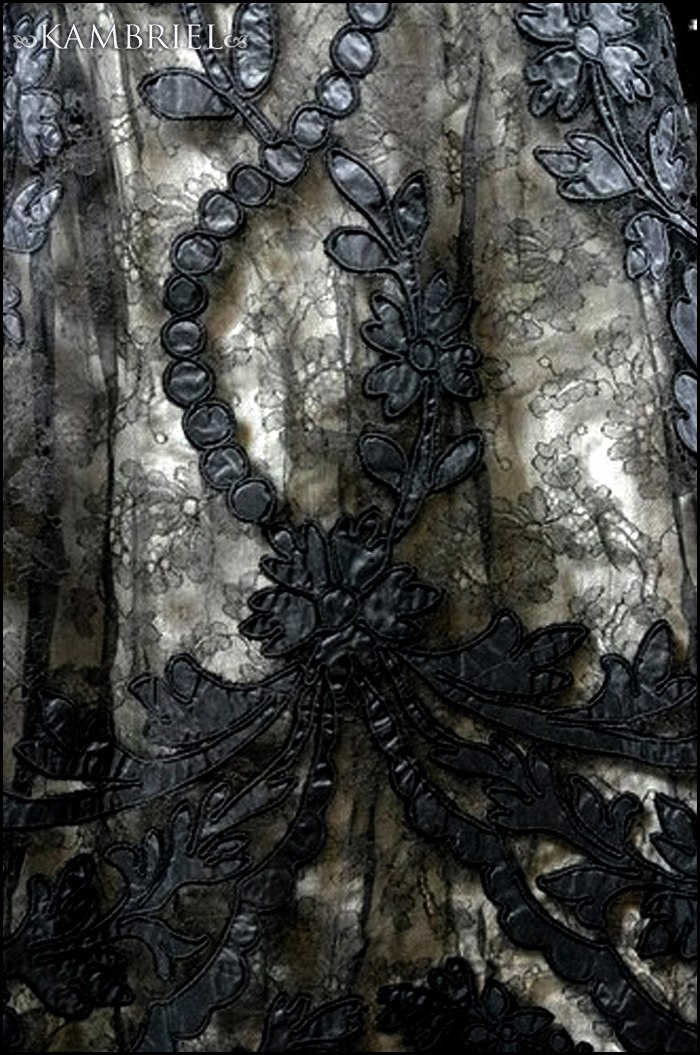 I found this absolute treasure of an antique Victorian (Napoleon III) era two-piece gown ensemble (comprised of a matching bodice top & skirt) many years ago in France. I've had my work featured in a Gothic Victorian museum exhibit before with a focus on mourning wear, and this piece is every bit as sumptuously detailed & lovingly made as those on display if not moreso. It has such an elegant, ghostly effect flowing out with an abundance of lace accented with graceful hand-cut silk appliqué work throughout, edged in delicated black cording, all of which gracefully drapes as it flares outward towards the very full lower hem with dramatic sweeping train. The ensemble has pale contrast lining within to help show off the incredibly delicate lace designs and give a darkly ethereal feel. Due to the fragility of the materials, this could be simply used for display, but it could also become the base of a hauntingly beautiful ensemble where this fragile beauty's signs of the passage of ~well~ over a century will add a sense of lush timeworn history to the overall effect!